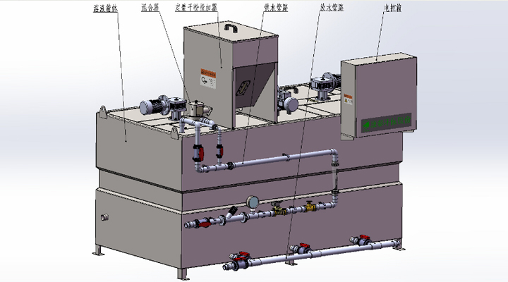 料斗中的粉狀劑經定量供料裝置送入混合器中,與水進行混合后進入溶液箱中,混合液經攪拌后形成均一濃度的溶液,再進入貯液箱內,經計量泵投加至加點。
